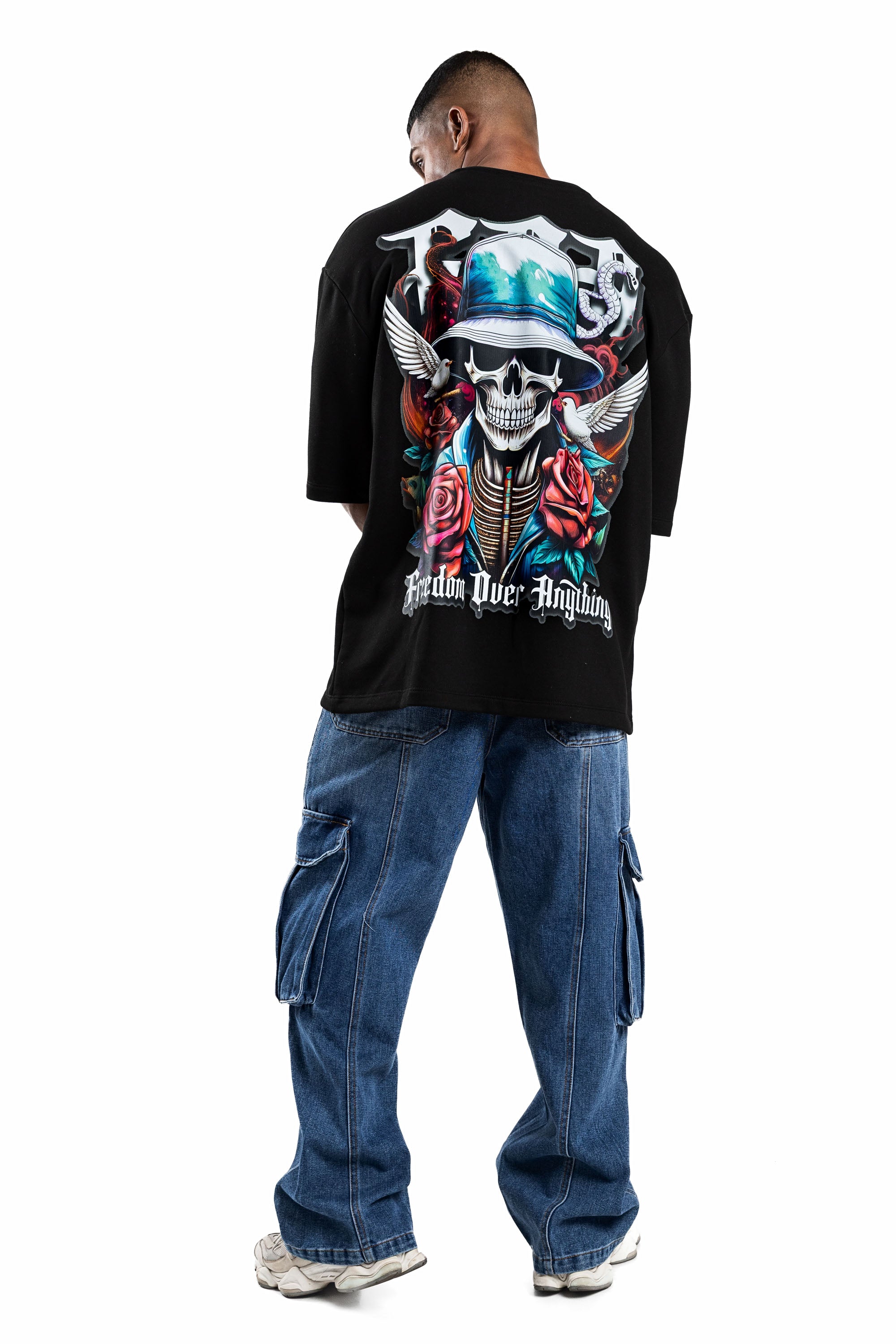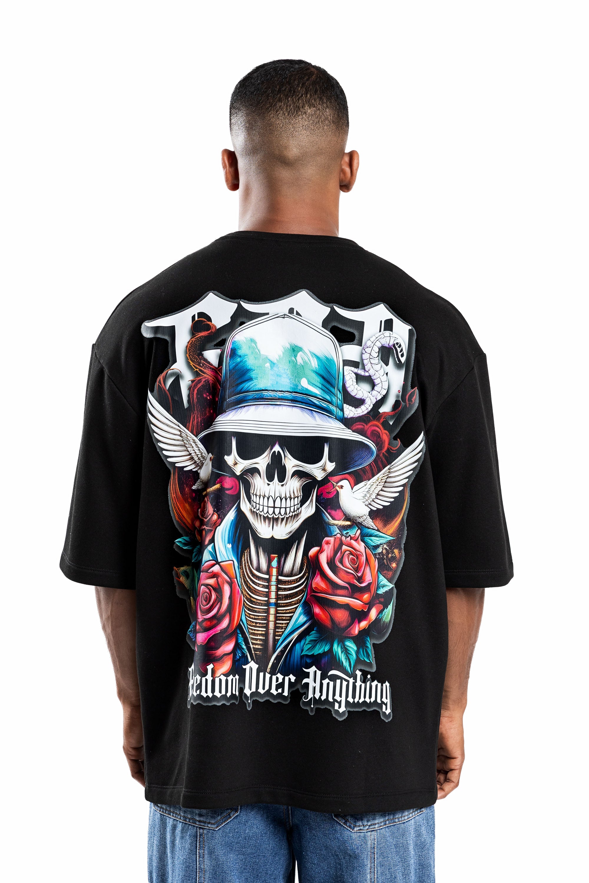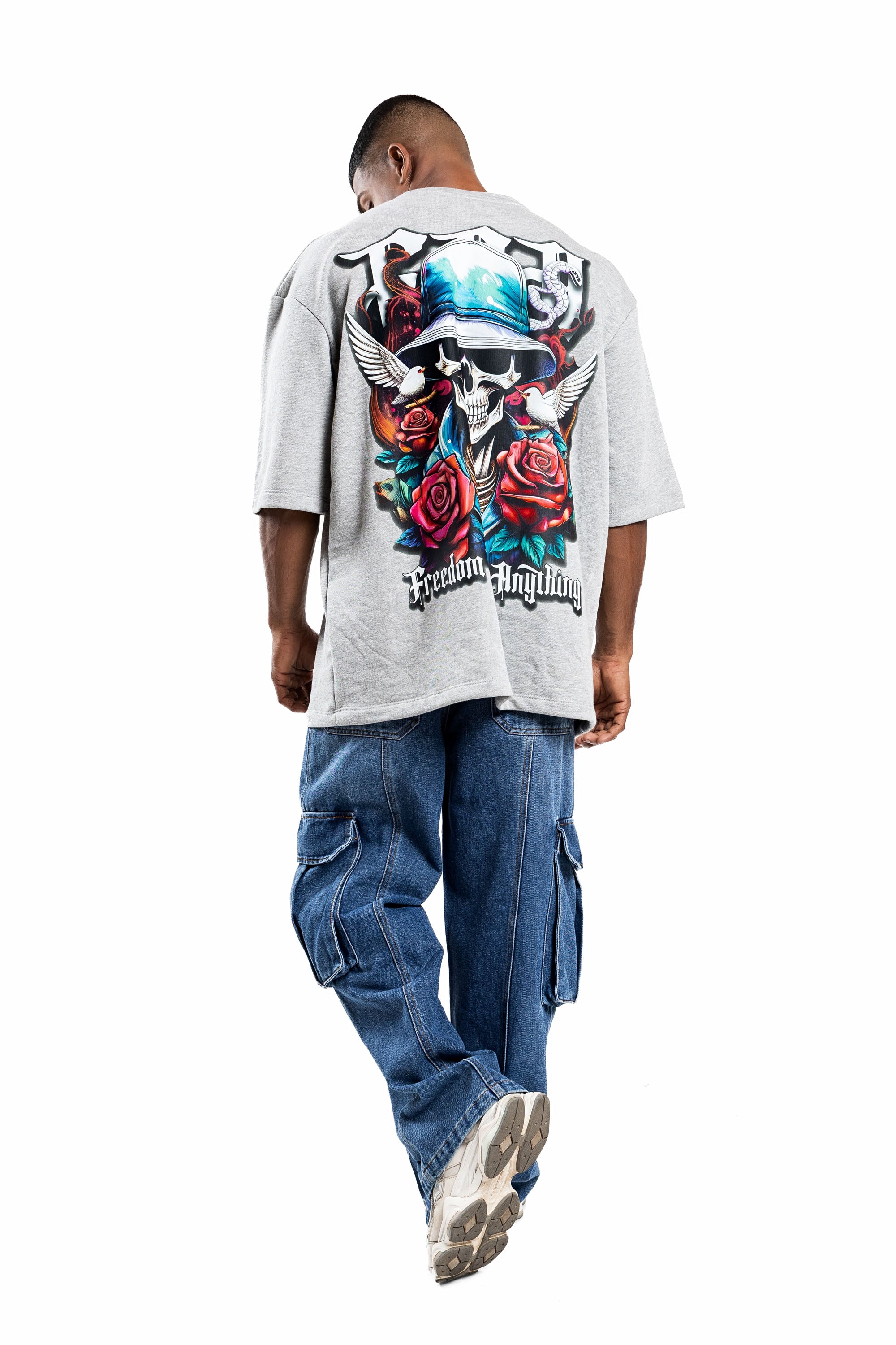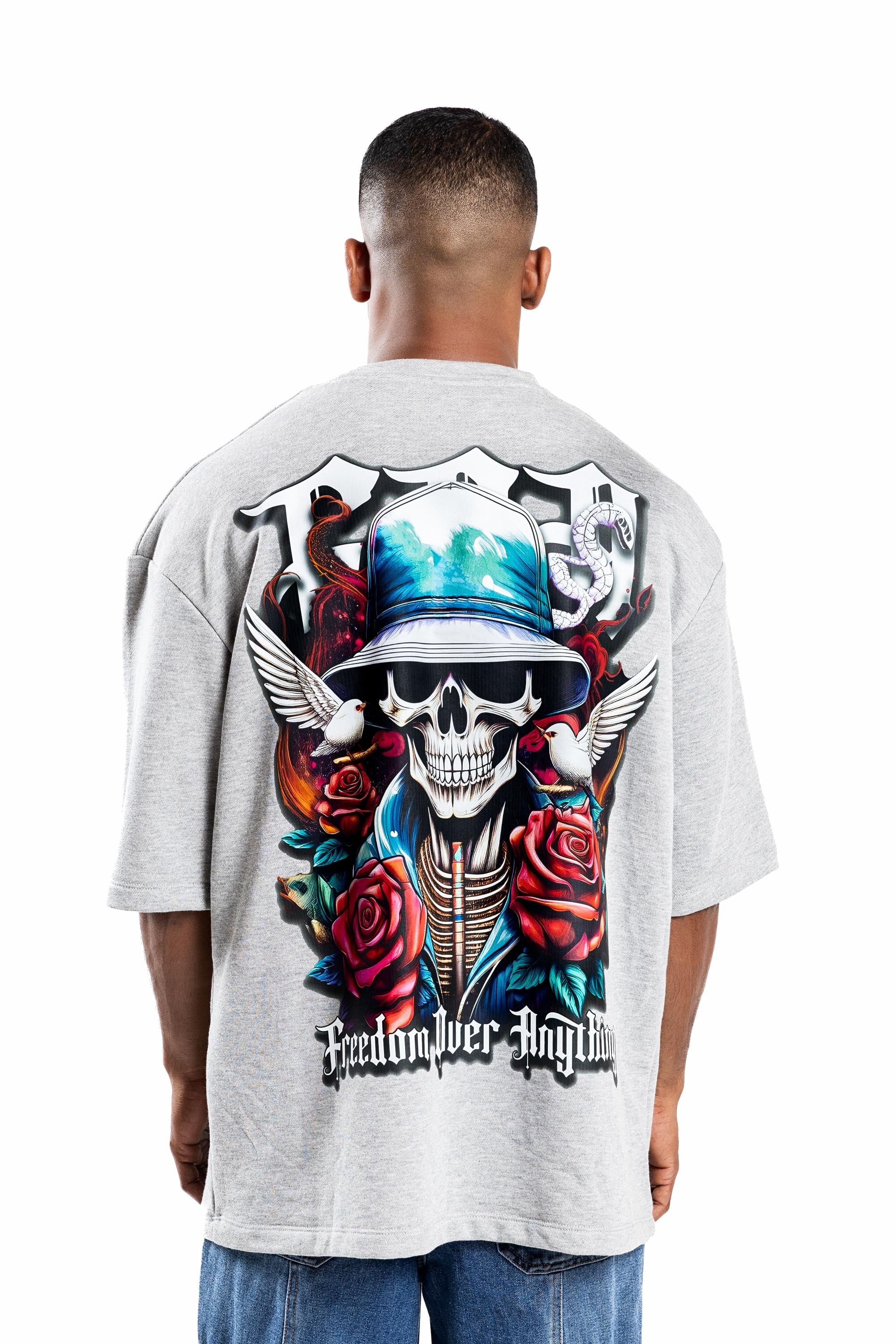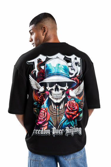 Design: Short sleeves, classic crew neck, featuring a front chest logo and a large-scale back graphic with skeletal motifs, roses, and "Freedom Over Anything" text.