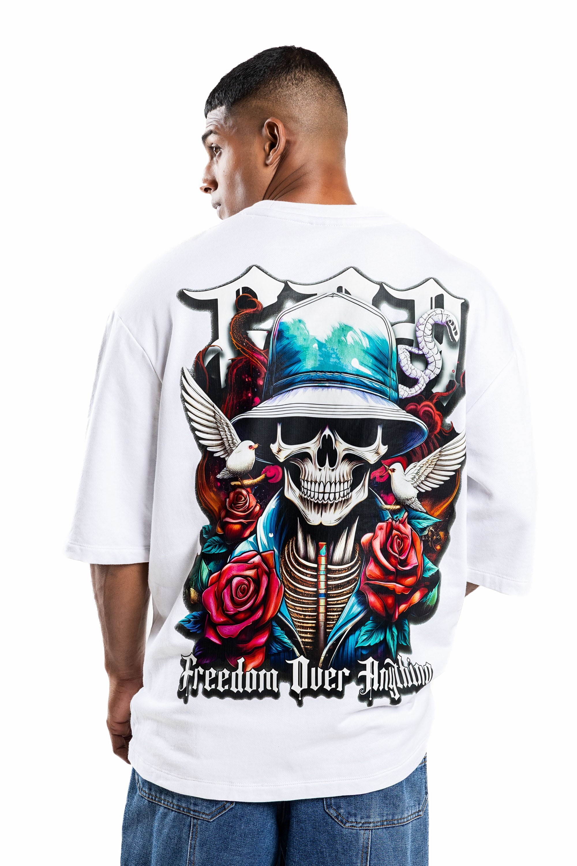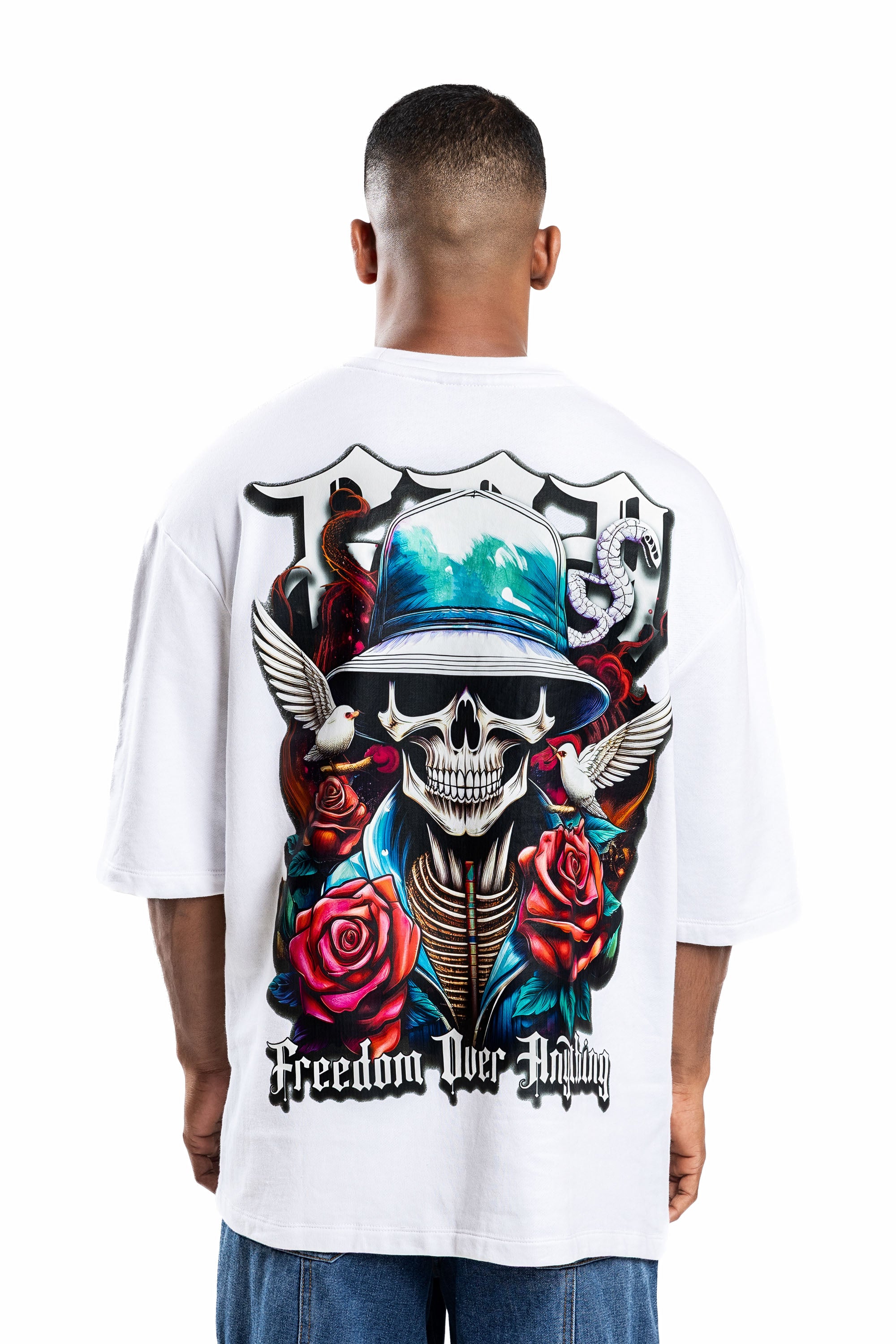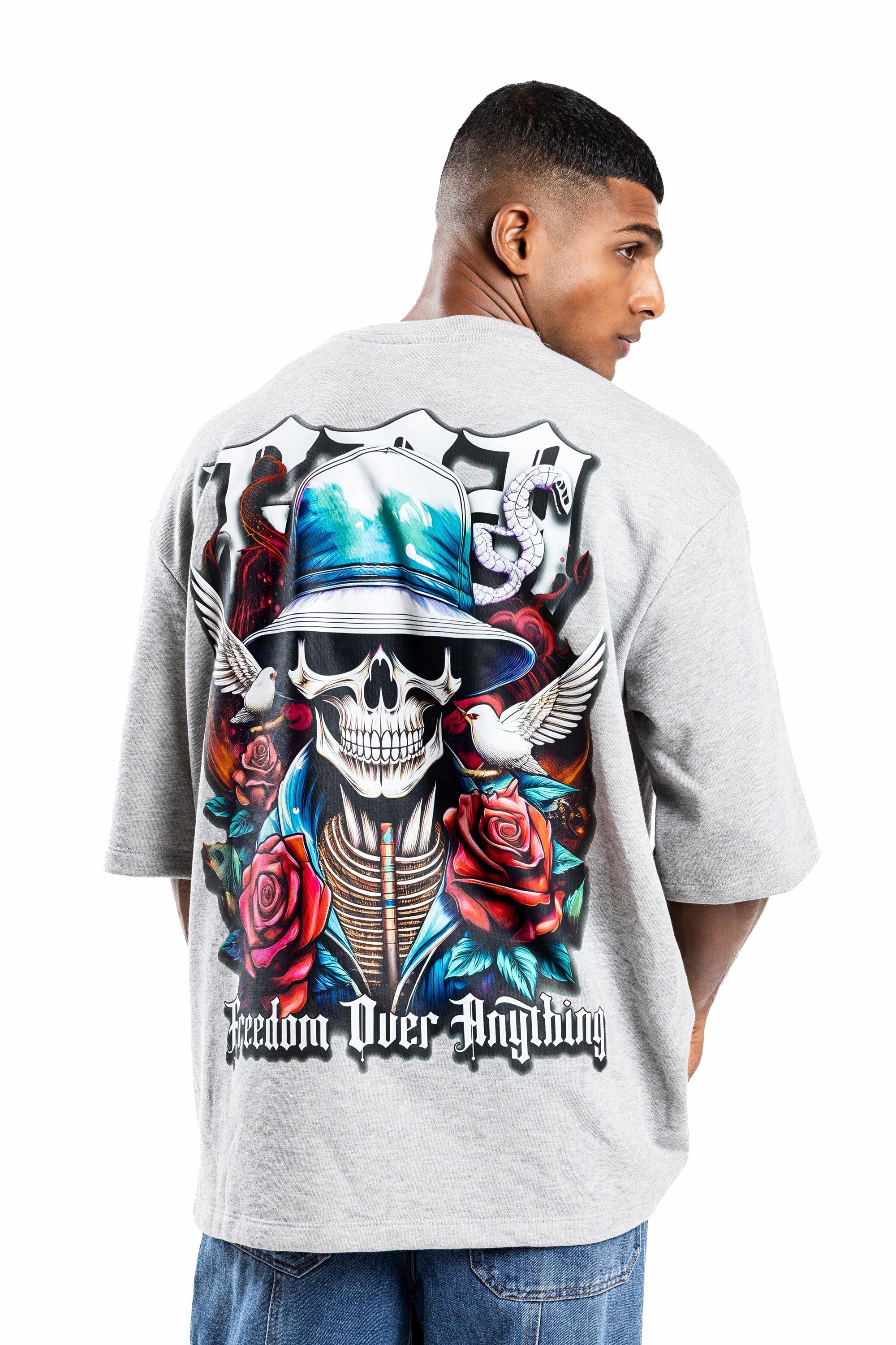 Design: Short sleeves, classic crew neck, featuring a front chest logo and a large-scale back graphic with skeletal motifs, roses, and "Freedom Over Anything" text.