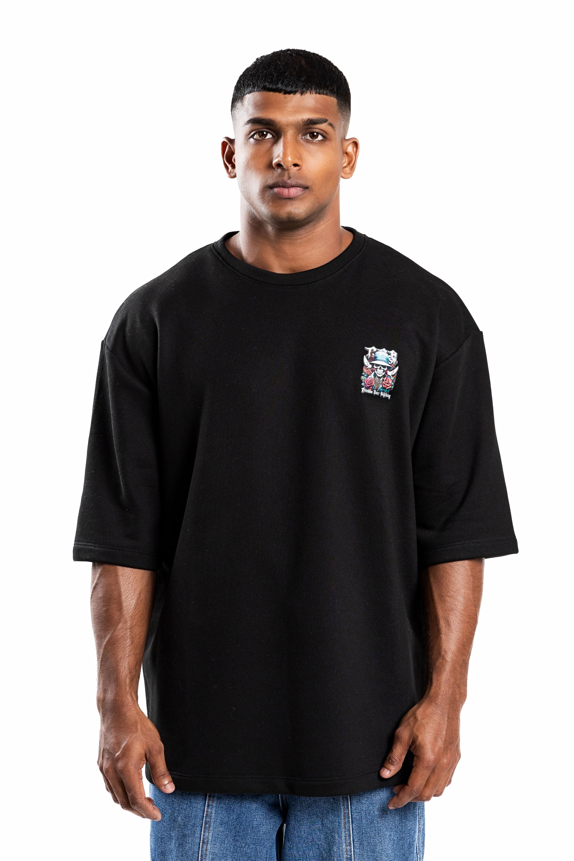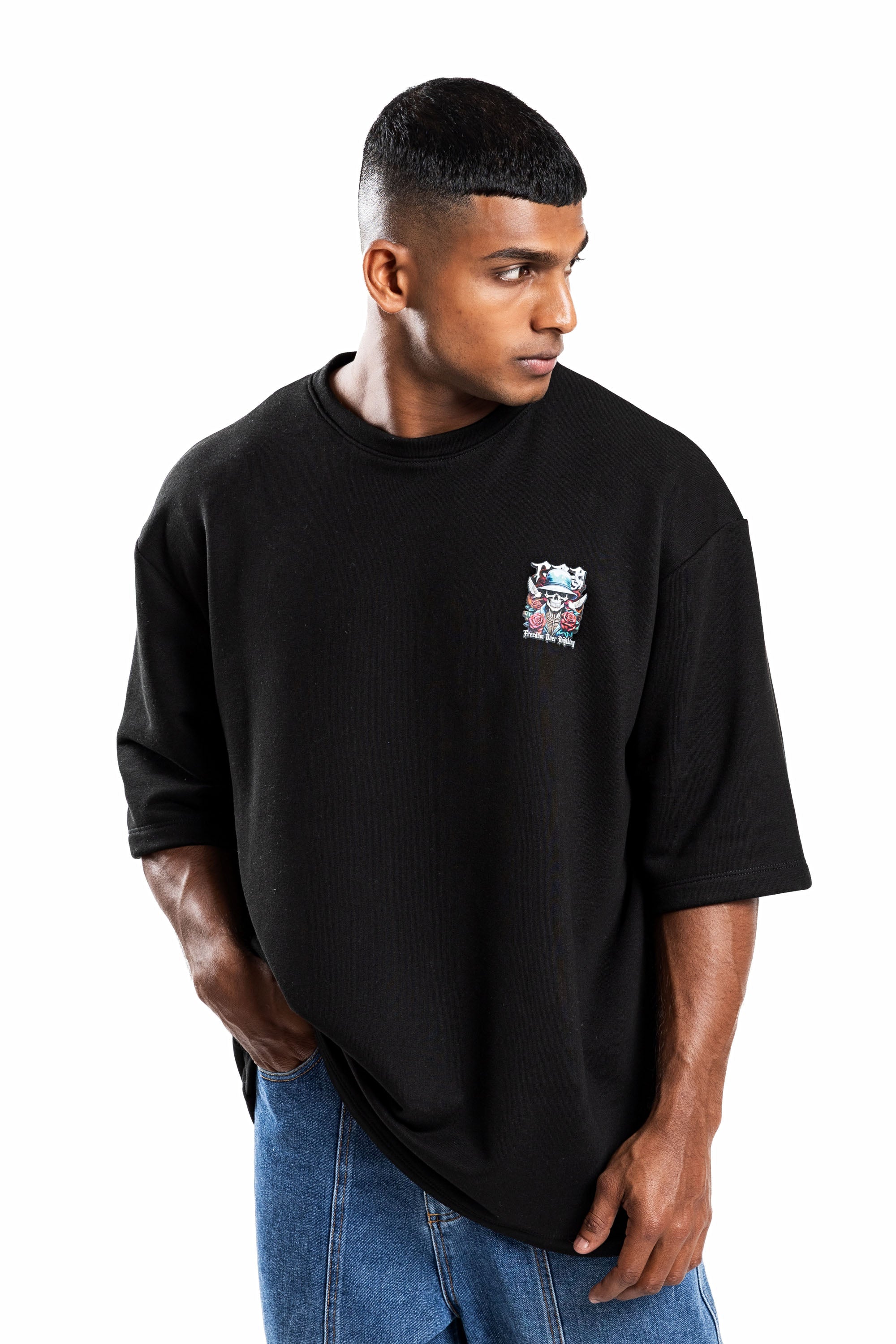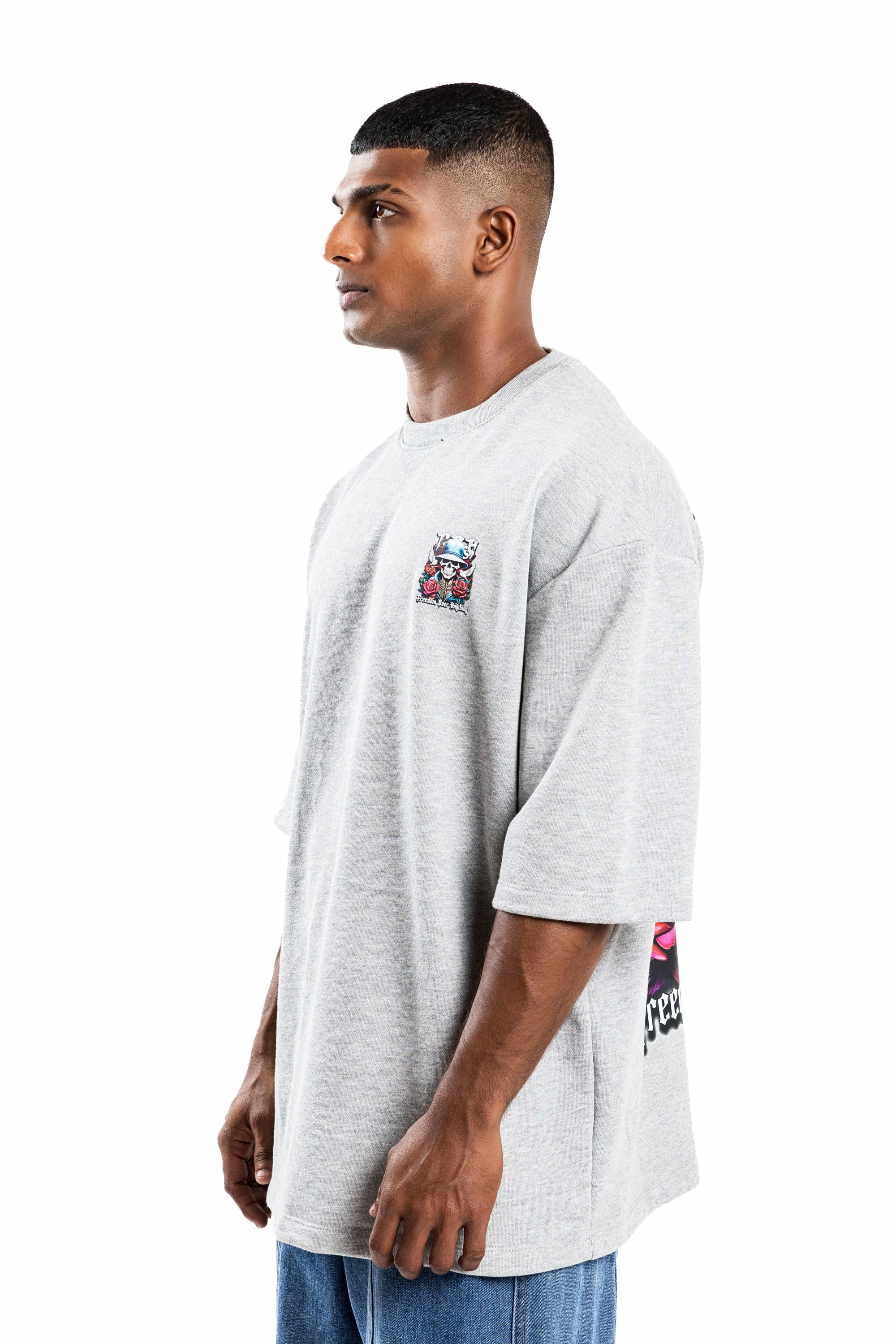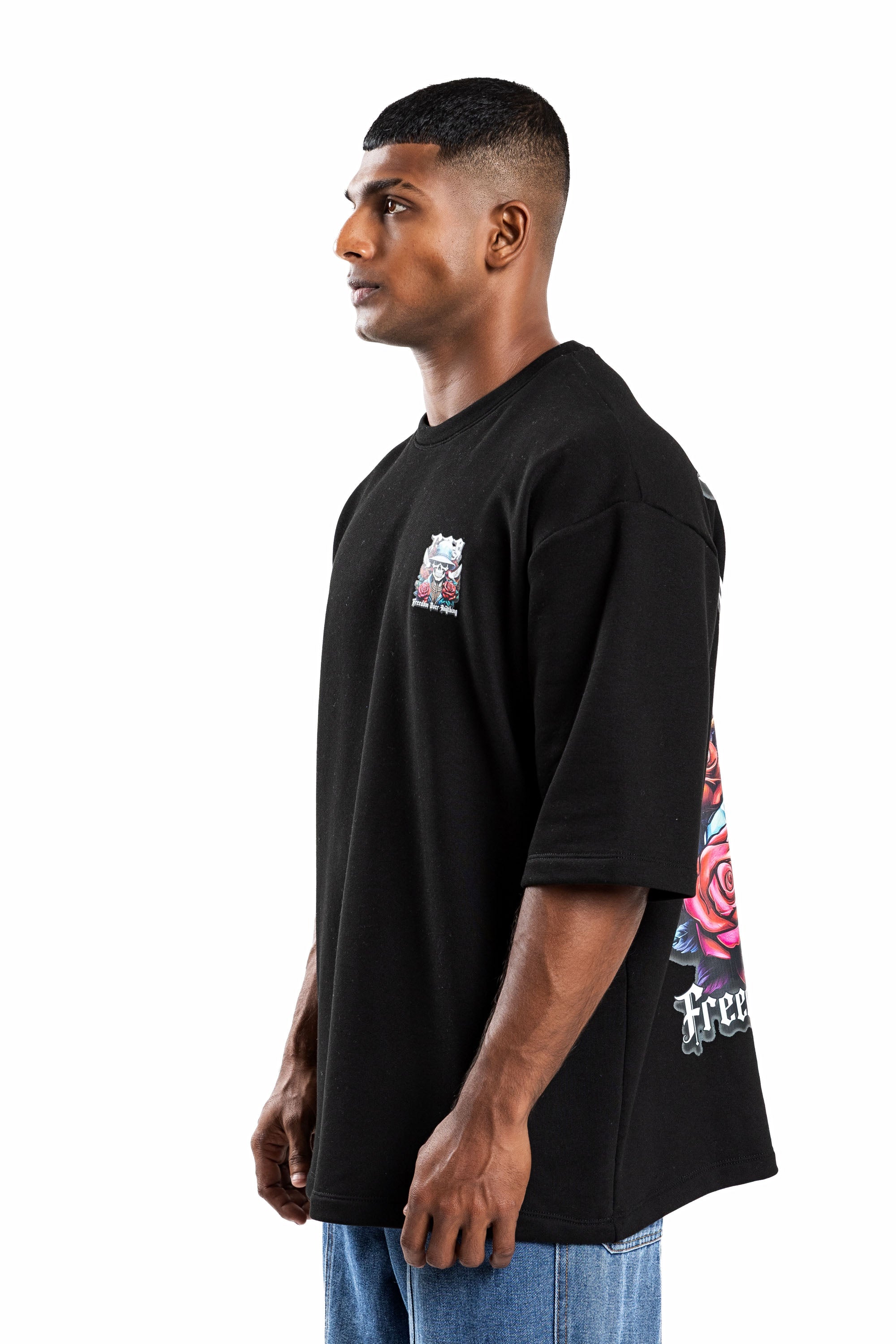 Design: Short sleeves, classic crew neck, featuring a front chest logo and a large-scale back graphic with skeletal motifs, roses, and "Freedom Over Anything" text.