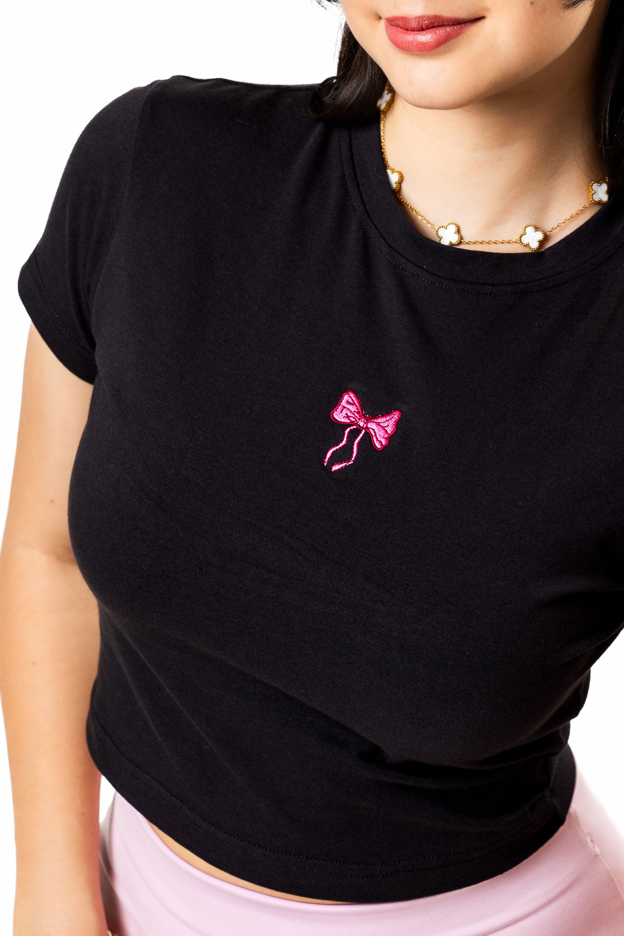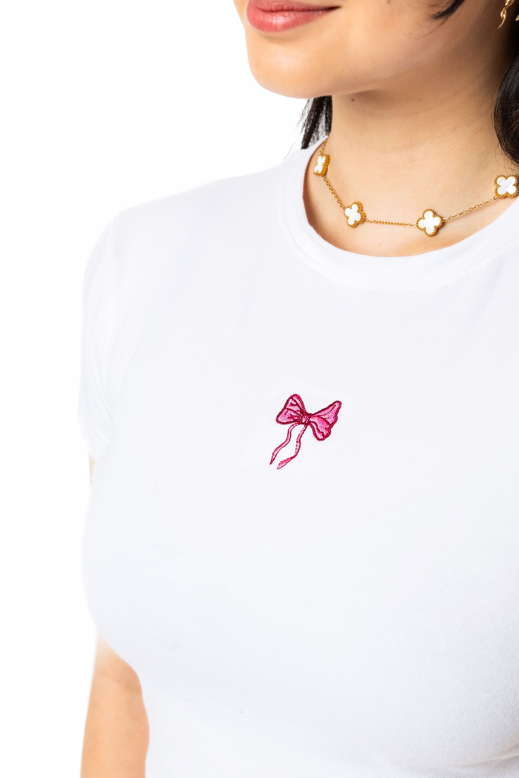 Playful elegance meets everyday comfort in the Ribboned Whimsy Crop Tee. Designed for