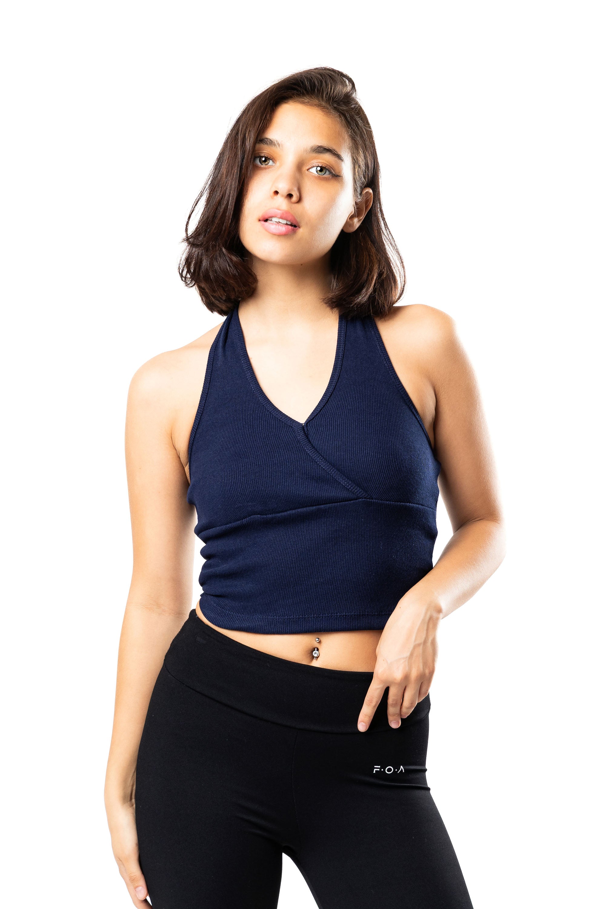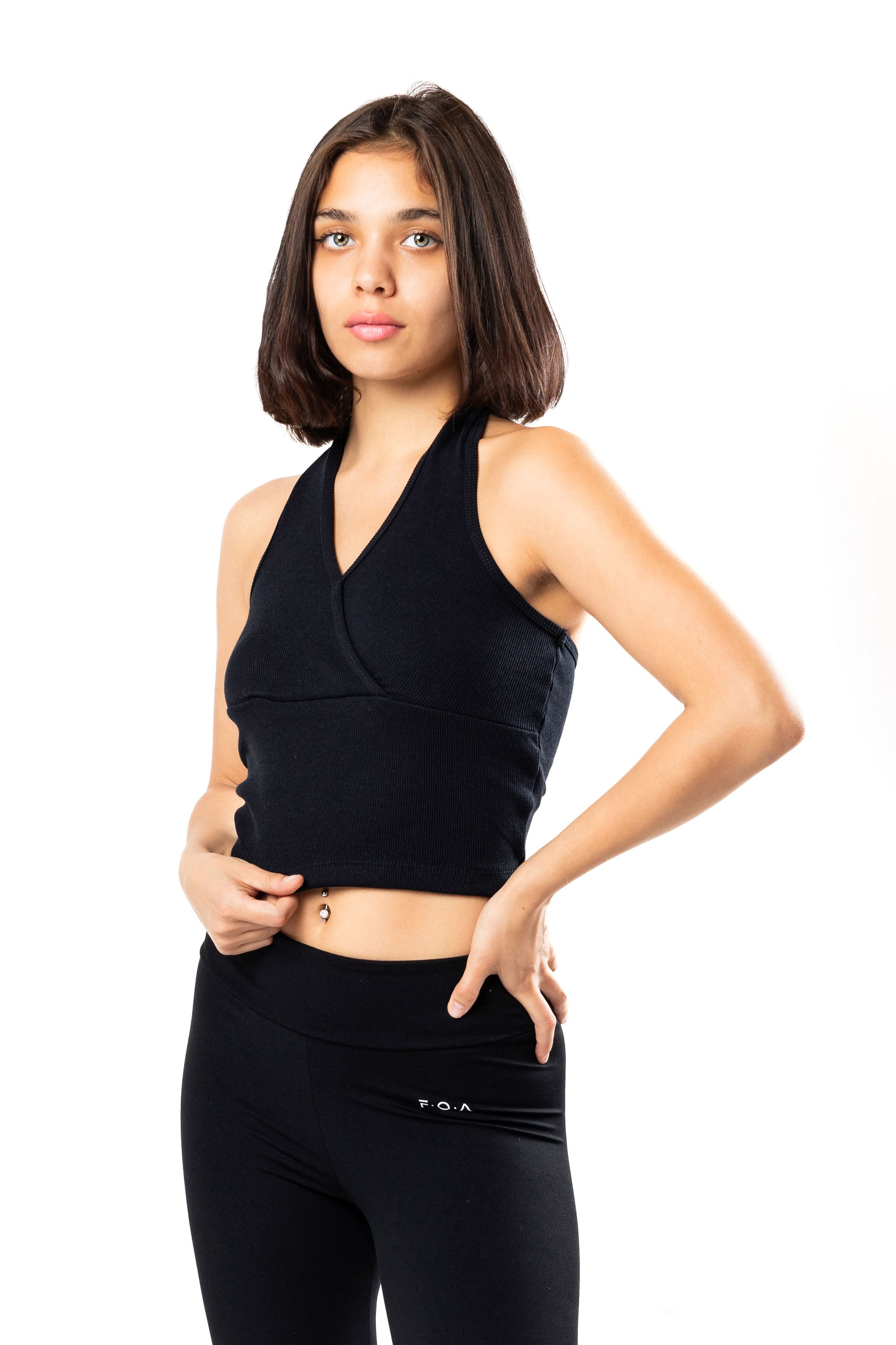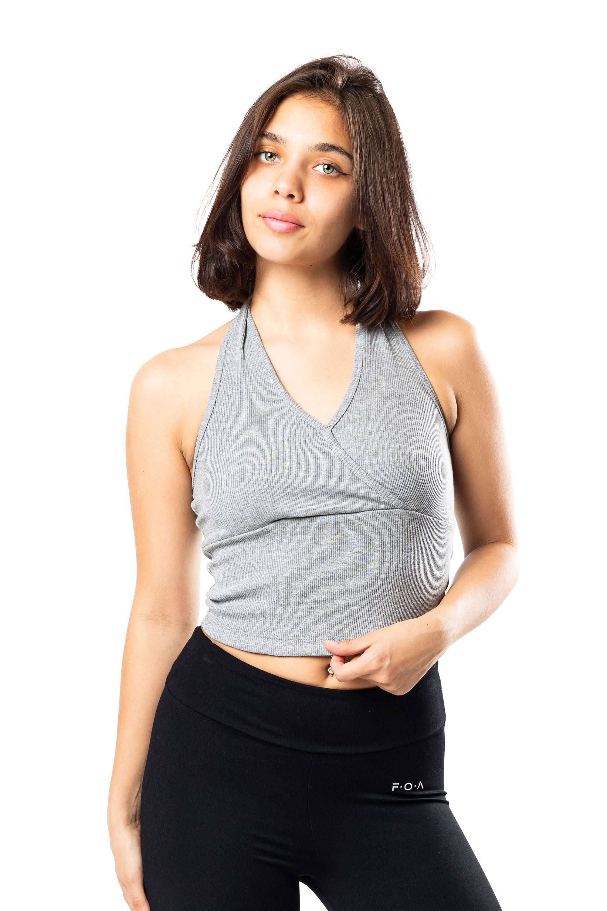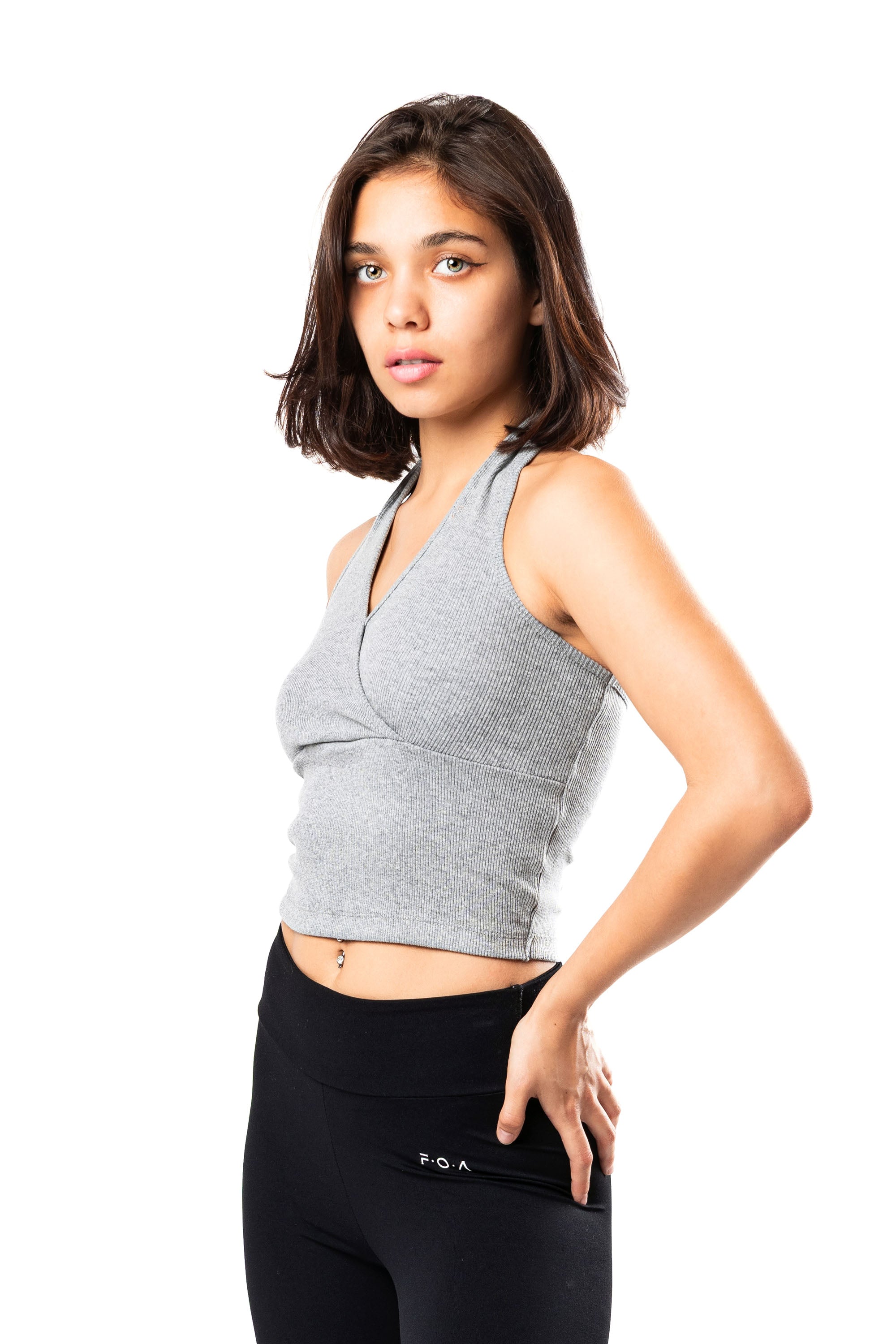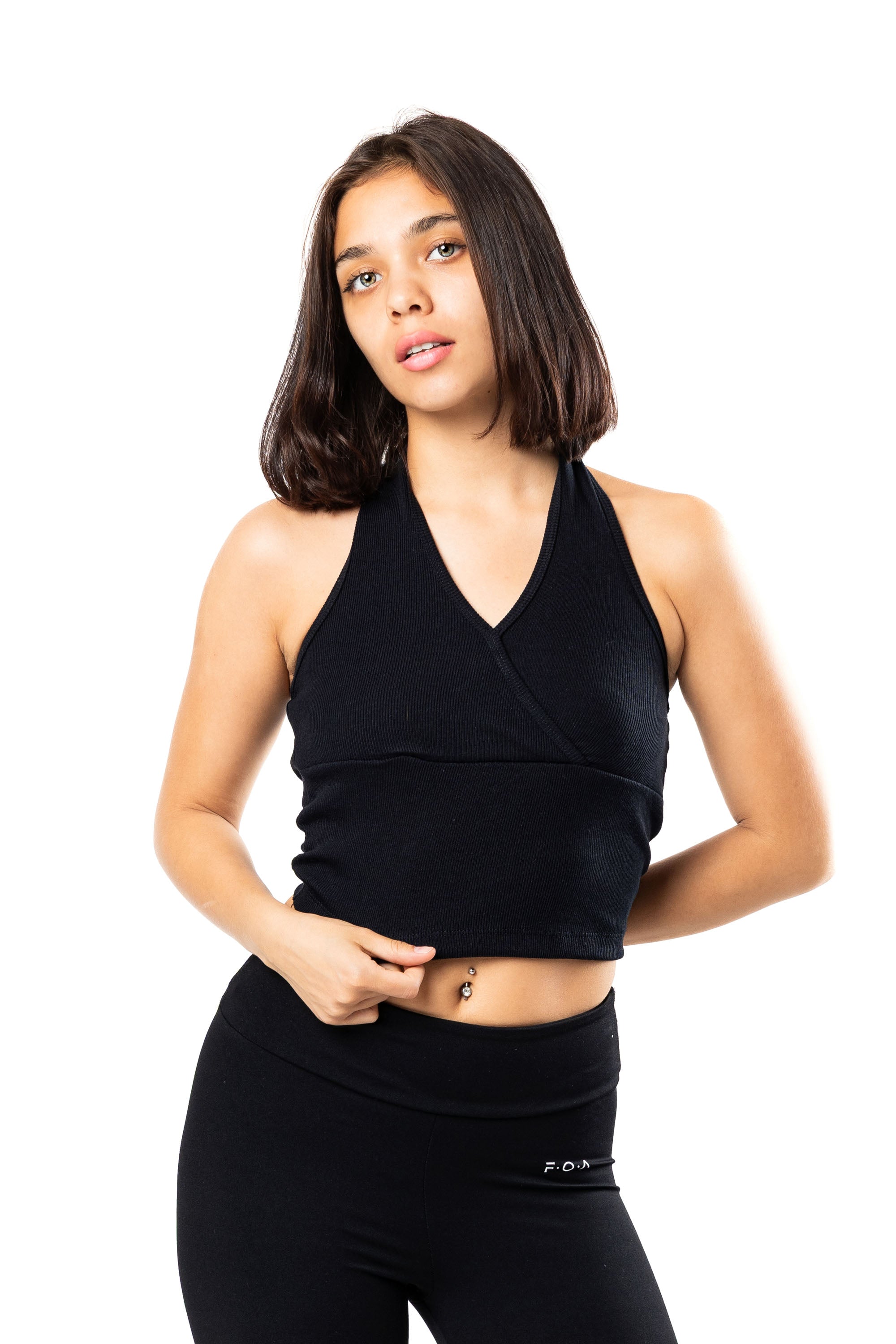 and adjustable halter straps, this cropped silhouette accentuates your figure while